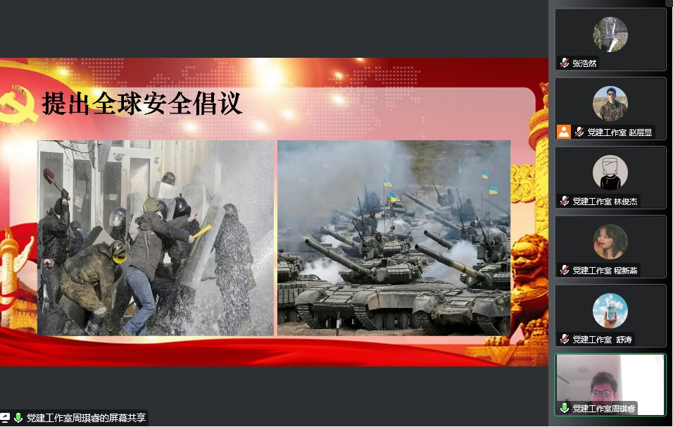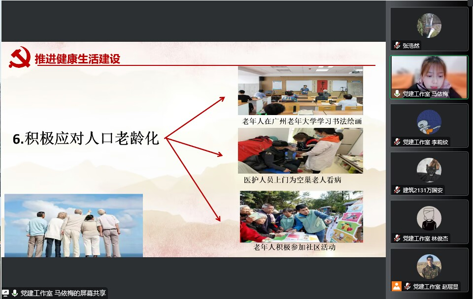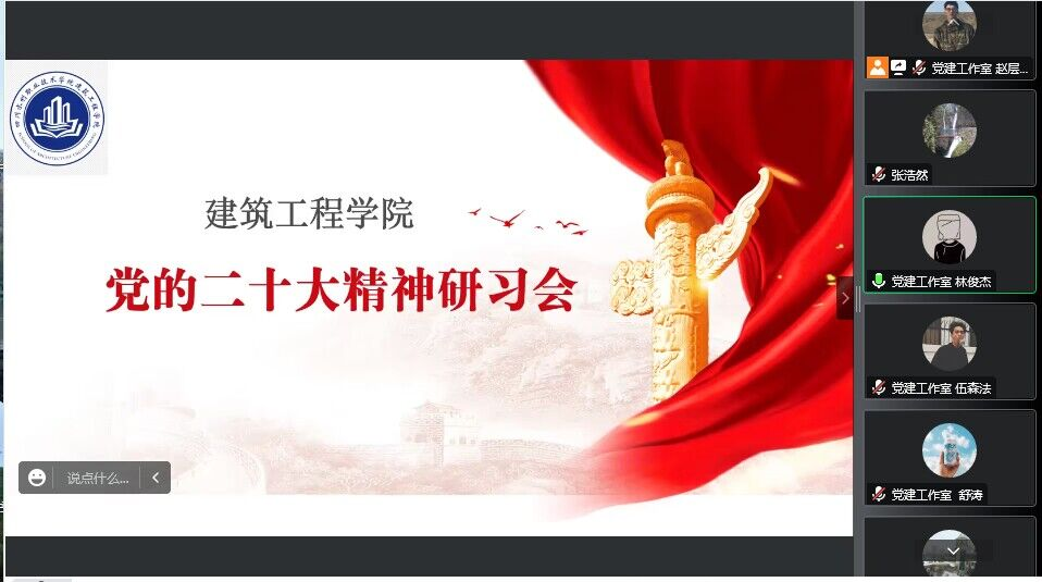 为深入学习贯彻党的二十大精神,引导入党积极分子争做有理想、敢担当、肯奋斗的新时代好青年,建筑工程学院学生党建工作室于2023年2月23日晚在线上举办了学习党的二十大精神研习会。本次活动由学生党建工作室的八位同学主讲,建筑工程学院学生党支部书记、第60期、第61期入党积极分子参加活动。