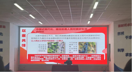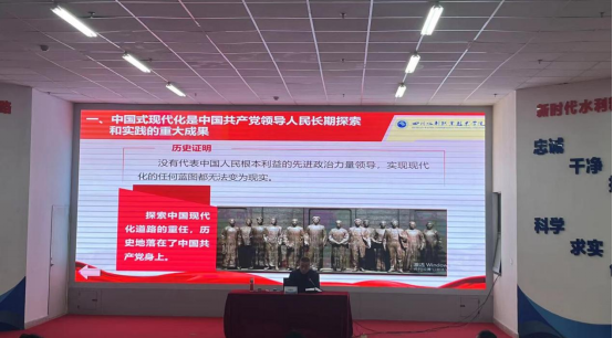 于建华以学习贯彻习近平新时代中国特色社会主义思想主题教育工作会议讲话为切入点,从孙中山先生谋求现代化开始,回顾了中国式现代化的发展历程、解读了中国式现代化的主要特征、阐述了推进中国式现代化的战略意义。他指出,中国式现代化是人口规模巨大的现代化,是全体人民共同富裕的现代化,是物质文明和精神文明相协调的现代化,是人与自然和谐共生的现代化,是走和平发展道路的现代化。中国式现代化是物质现代化、制度现代化、人的现代化三位一体。中国式现代化道路将为人类实现现代化提供新选择,开辟出一条21世纪现代化新路,创造人类文明新形态。最后,他强调,我们要深入理解“中国式现代化”,切实做到坚定不移听党话、跟党走,做有理想、敢担当、能吃苦、肯奋斗的时代好青年,为以中国式现代化全面推进中华民族伟大复兴贡献青春智慧!
