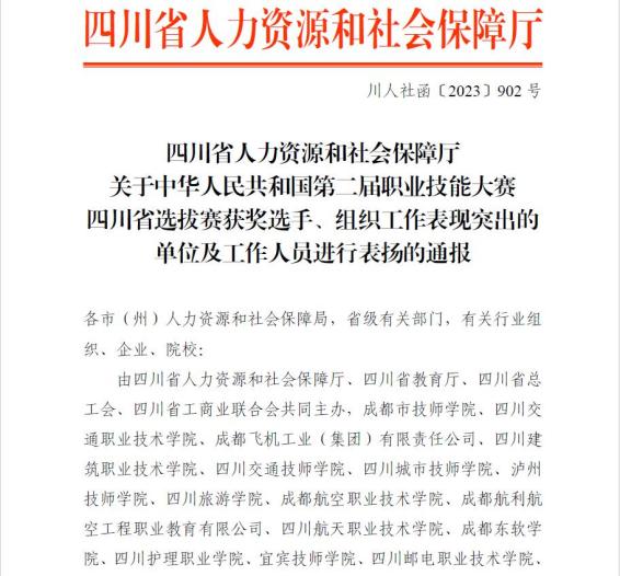 2023年11月15日,四川省人力资源和社会保障厅发布通报,对中华人民共和国第二届职业技能大赛四川省选拔赛获奖选手、组织工作表现突出的单位及工作人员进行表扬。建筑工程学院学生谭森元在肖鹏和陈燕萍老师的指导下,经过三个多月的练习,最终获得建筑信息建模赛项三等奖。