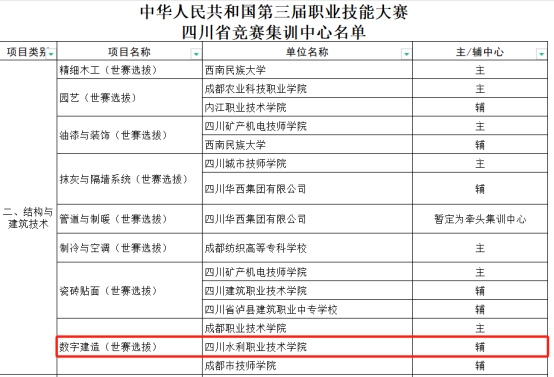 近期,四川省人力资源和社会保障厅公示了中华人民共和国第三届职业技能大赛四川省竞赛集训中心名单。经过项目申报、初审推荐、条件复审、专家评分和综合评议,建筑工程学院申报的数字建造(世赛选拔)赛项获批中华人民共和国第三届职业技能大赛四川省竞赛集训中心,这是我院首次获批该赛项的省级竞赛集训中心。