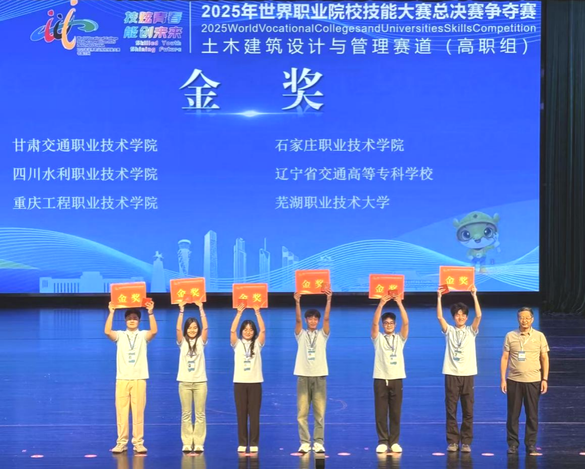 本次大赛有来自全国26个省(直辖市)、4个自治区和新疆生产建设兵团的715名选手同场竞技。四川水利职业技术学院建筑工程学院代表队凭借过硬的专业技能、创新的解决方案和出色的团队协作,在竞争中脱颖而出,成功摘得该赛道金奖。这也是我校继2024年斩获同赛事土木建筑赛道 “建筑信息模型建模与应用(BIM)”赛项金奖后,再次在世界职业院校技能大赛舞台上彰显“四川水院实力”。