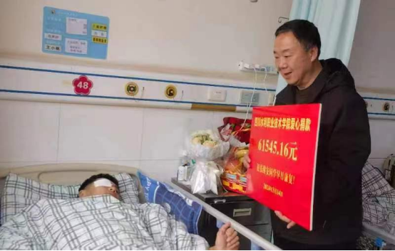 在感受到学校领导及老师同学们的温暖关怀后,张继安同学感动不已。他表示自己一定振奋精神,配合治疗,早日回归校园,以实际行动回馈学校和社会。