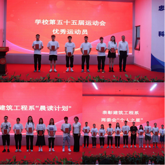 大会表彰了学校第五十五届运动会优秀运动员、建筑工程系“优秀共青团干部”“优秀共青团员”、两委会“个人之星”、手绘大赛获奖作品、“晨读计划”优秀班级、寝室文化节优秀寝室。