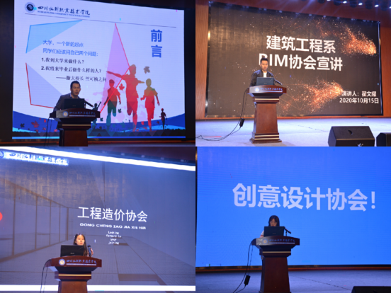 最后,来自BIM协会、造价协会和创意设计协会的负责学生分别对各自社团的发展情况做了宣讲,呼吁广大新生积极加入到建筑工程系的专业社团中,提升自己的专业技能。