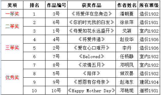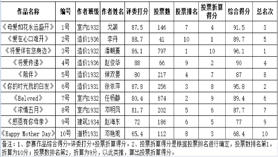 5月10日至5月24日,建筑工程系举办了母亲节海报征集大赛。此次大赛共征集到10幅海报作品,通过专业评委打分和学生线上投票两个环节,对参赛作品进行了综合评比,决出了一等奖、二等奖、三等奖和优秀奖。