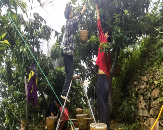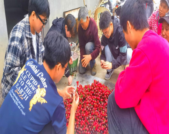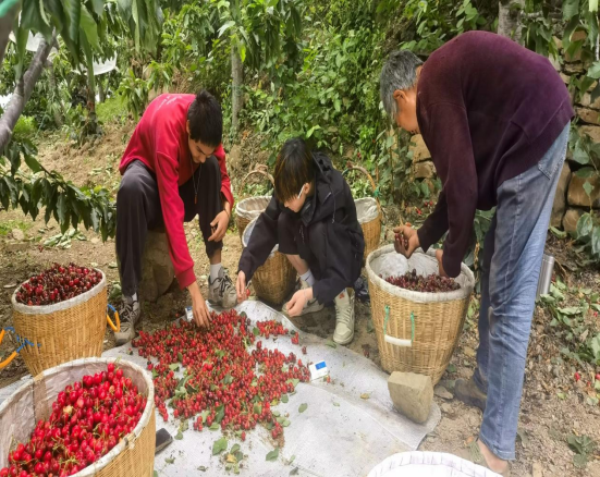 松江村地处川西南边远山区,海拔较高。近些年来,在国家精准扶贫及乡村振兴政策的推动下,当地生产生活条件有了一定程度的改善,也和汉源县其他地区一样,发展了车厘子种植产业,但相比其他地区,松江村的基础条件仍存在一定差距,村里老人所占比例较大,对电商销售不熟悉,导致村民出售农产品较为困难。张继安同学的养父是一位残疾老人,行动不便,且在家中独居,更加剧了车厘子出售的困难。目前,正值车厘子成熟采收季节。学院小分队到达张继安同学家中后,不仅帮助他们家做农活,还每天凌晨5点起床帮助采摘车厘子果。经过三天的采摘劳作,小分队共采摘车厘子数百斤,并采用以购代捐等方式解决了销售问题,使张继安家庭实现增收数千元,在一定程度上提升了他们的生活质量。