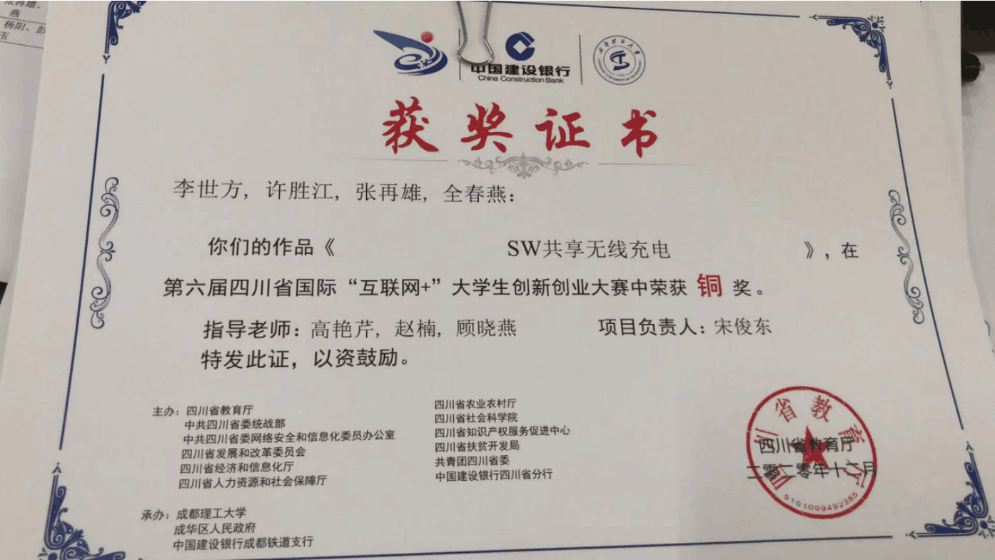 6、SW共享无线充电,第十六届“挑战杯”四川省大学生课外学术科技作品竞赛,三等奖