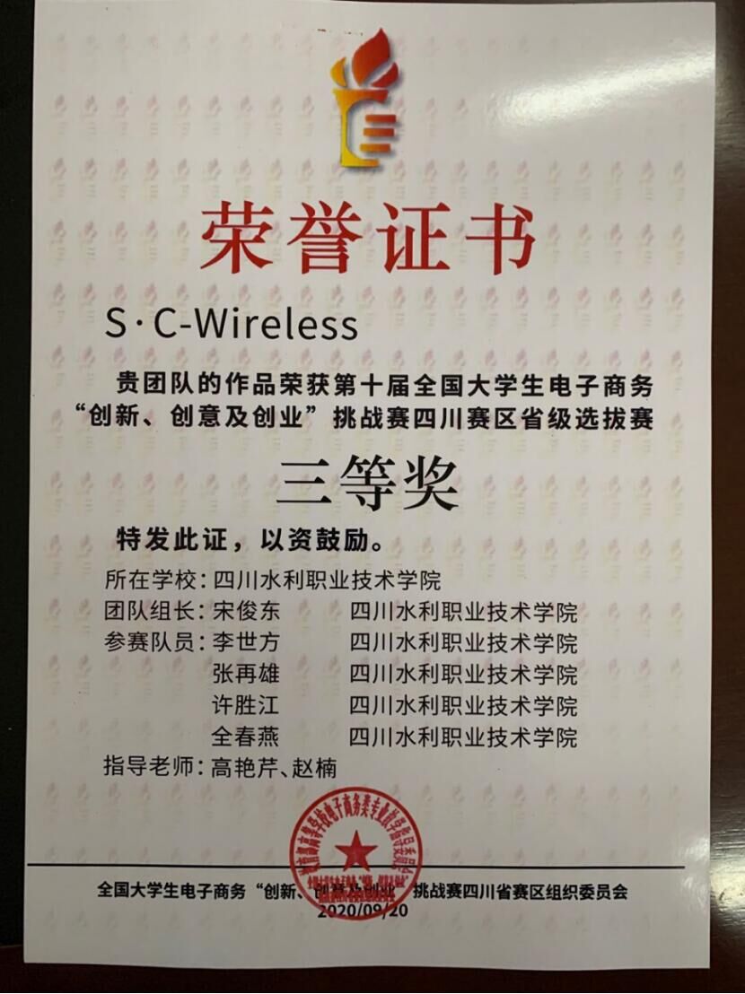 4、S.C-Wireless,第十届全国大学生电子商务“创新、创意及创业”挑战赛四川赛区省级选拔赛,三等奖