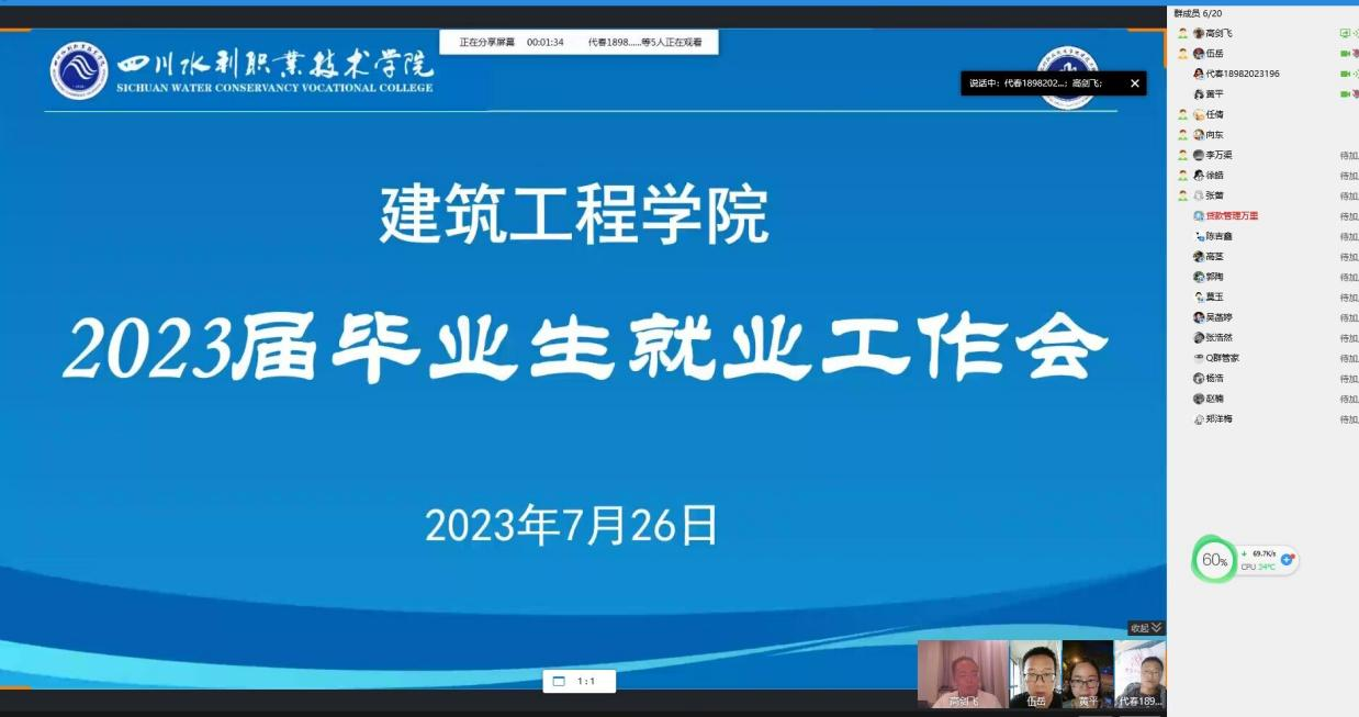 为进一步推进2023届毕业生就业工作,实现学校双高建设的目标,2023年7月26日晚19点,建筑工程学院在线上召开2023届毕业生工作视频会。学院党总支书记高剑飞主持会议,就业干事和毕业班辅导员老师参会。
