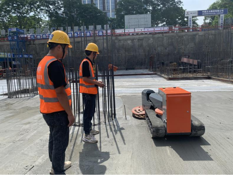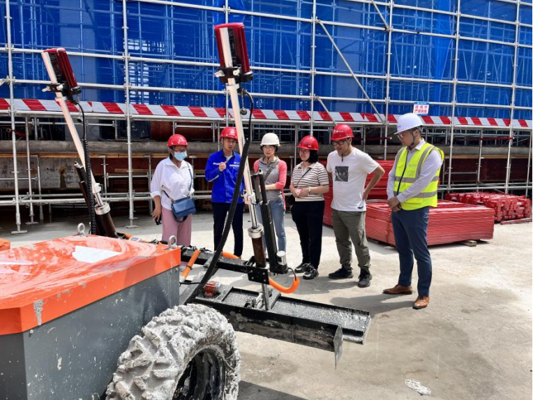 李万渠一行在项目现场负责人李代建、苏州方石科技公司技术人员朱万和四川省宏业建设软件有限责任公司技术负责人王燕的陪同下参观了施工现场,并就在本项目投入使用的四轮激光地面整平机器人、履带抹平机器人和四盘地面抹光机器人三种智能建造机器人展开了深入详细的交流。