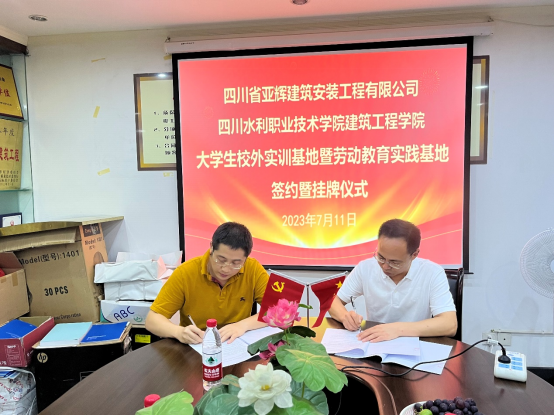为全面贯彻党的教育方针,建筑工程学院与四川省亚辉建筑安装工程有限公司达成合作共识,共建大学生校外实训基地暨劳动教育实践基地。2023年7月11日,双方在崇州市举行签约挂牌仪式,学院党总支书记高剑飞、亚辉公司总经理孙宝签订共建协议并挂牌。