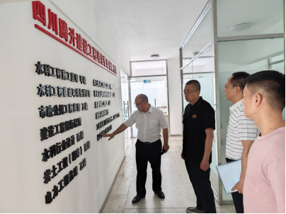 在四川腾升建设工程项目管理有限公司总经理黄建勋的陪同下,于建华一行参观了公司办公环境,详细了解了公司文化建设,随后与位于德阳的五家公司负责人进行座谈交流。与会五家公司分别是四川腾升建设工程项目管理有限公司、四川腾耀建筑工程有限公司、四川九之信工程检测有限公司、四川星悦绿水工程咨询有限公司、广汉市凯帝乐门业有限公司。